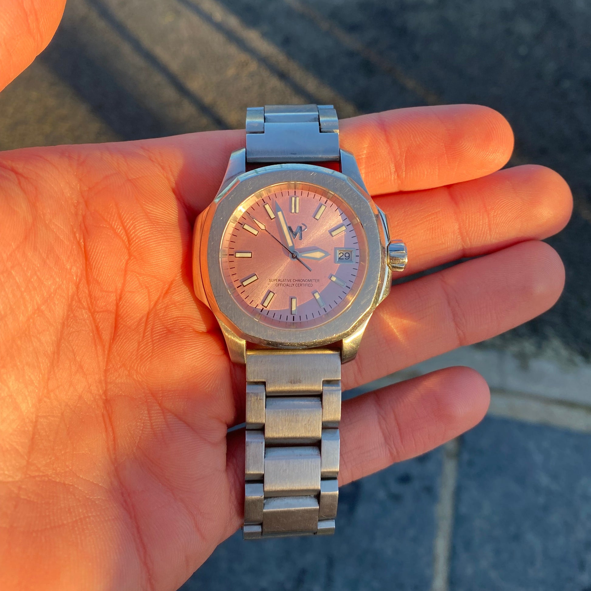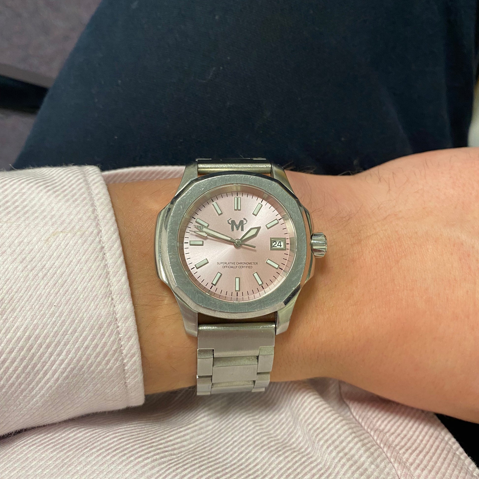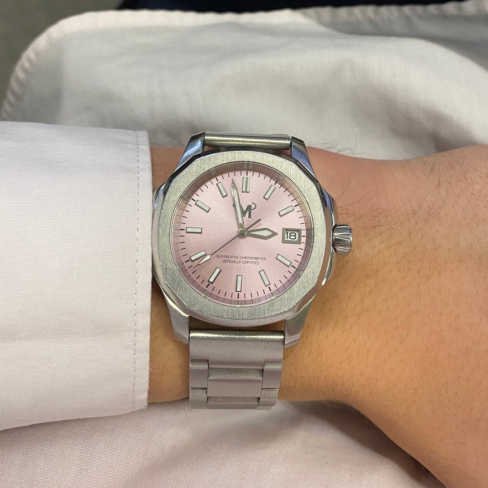 The Maco: Pink features a pink, sunburst dial with white, luminious hands and a saphire crystal. Enclosed in the classic, octagonal, "maco" stainless steel case with engravings on the caseback and strap clasp.
